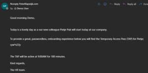 Home»Automation»Build your own user onboarding automation – Day 1: enable the account and create a Temporary Access Pass»Automated User onboarding – day 1 send TAP 40