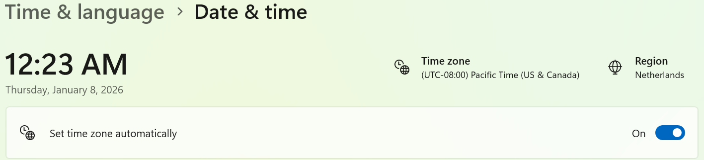 We can overcome that by configuring Windows to automatically update the time zone, based on the location, so let’s also have a look at that option.