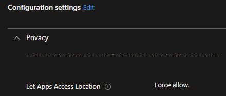 We need to create a Settings Catalog policy. In the Privacy section we find the setting Let Apps Access Location. Set this setting to Force allow.