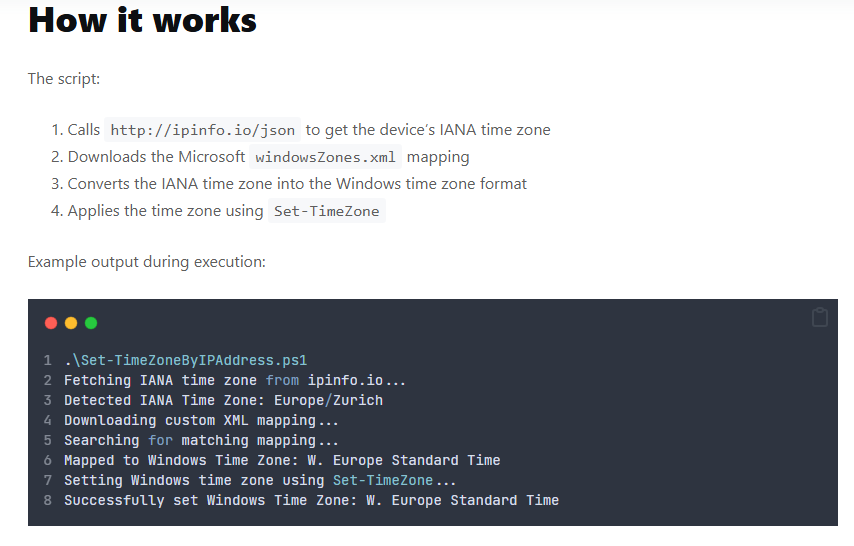 The benefit of this solution is that we only need to manage the script and one Intune policy, even if we manage devices in multiple countries, and the time zone is automatically configured correctly based on the device location.