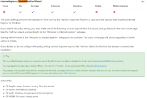 Home»Intune»Manage Internet Explorer settings with Intune»Intune CSP DisableFirstRunWizard